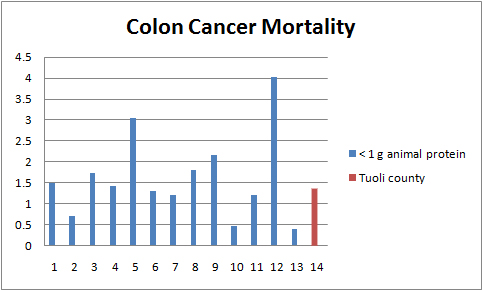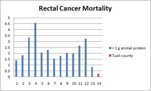 And since lack of fiber is supposed to harm colon health, here is a comparison of colon cancer and rectal cancer mortality (per 1000 people) between the plant-noshing counties and the vegetable-phobic Tuolians.