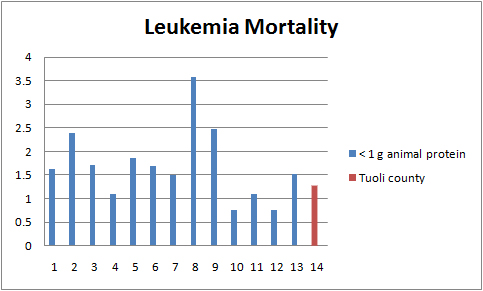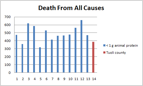 First up: Death from all causes (per 1000 people under the age of 65). Remember, Tuoli county is the red bar; the blue bars represent the near-vegan counties in the China Project that consumed less than 1 gram of animal protein per day on average.