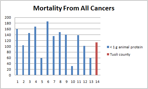 How ’bout them apples? Tuoli doesn’t appear to have higher cancer rates than the near-vegan areas. Eight counties have higher rates and only five have lower ones, leaving Tuoli hovering near the lower-middle end of the spectrum.