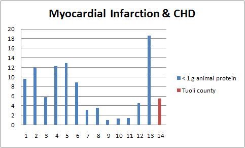 Surprised? Despite a massive intake of cholesterol, saturated fat, calories, animal protein, and all those other horrors ascribed to declining heart health, the Tuoli have relatively low levels of coronary heart disease and heart attacks. Seven near-vegan counties have higher rates than Tuoli, and six have lower rates.
