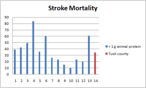 Again, no significantly higher stroke rates for the Tuolians. Seven near-vegan counties have more incidences of stroke, and six have fewer incidences of stroke.