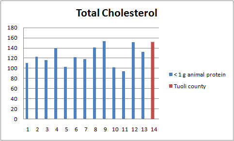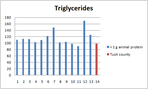 It seems Tuoli is pretty much neck-and-neck with the plant-eating counties. By American standards, triglyceride levels between 150 and 199 are considered borderline high, and lower numbers are considered normal—so only one county, a near-vegan one, had values outside a healthy range.