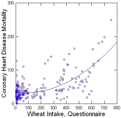 That’s a value straight from the original China Study data. Could the “Grand Prix of epidemiology” have accidentally uncovered a link between the Western world’s leading cause of death and its favorite glutenous grain? Is the “staff of life” really the staff of death? Bwah ha ha.