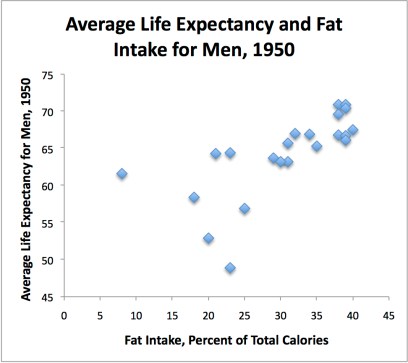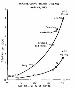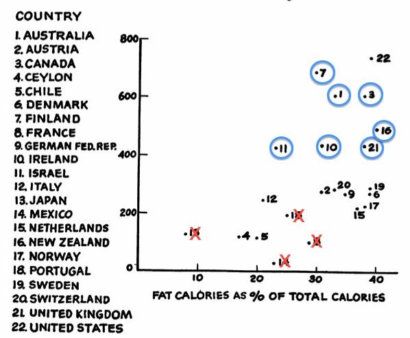 The study began with a great many more countries … but Keys deleted the countries whose results did not match his pre-conceived conclusions, leaving him with only Japan, Italy, Great Britain, Australia, Canada and the US. Full disclosure would have made a great deal of difference.