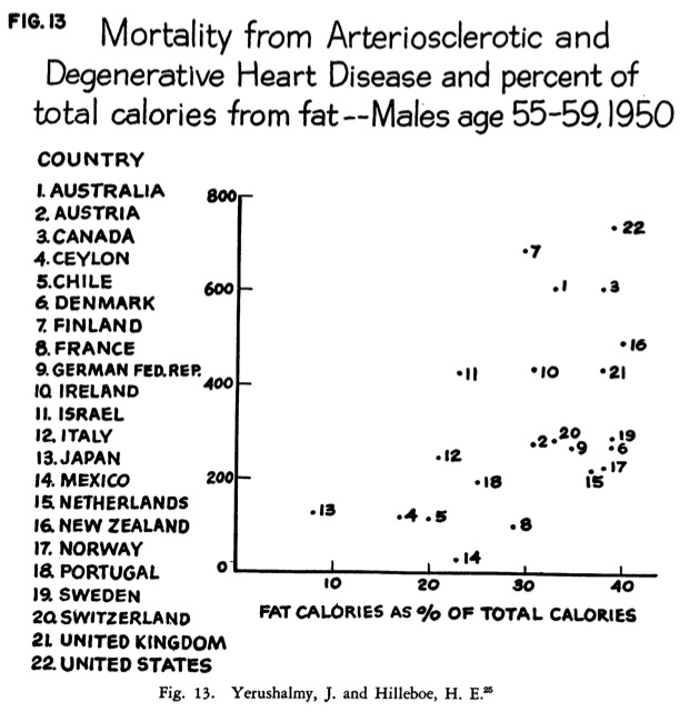 But the debate humiliation was small potatoes compared to what came next. In 1957, Jacob Yerushalmy and Herman Hilleboe—Berkeley statistician and New York State Commissioner of Health, respectively, who’d both attended the WHO meeting with Keys—wrote a scathing critique of Keys’ beloved graph. Their paper was titled “Fat in the diet and mortality from heart disease: A methodological note.” This, my friends, is the rebuttal that gets cited near and far as proof of Keys’ fraudulence, and is the source of that “original 22 countries” graph we saw a bit ago.