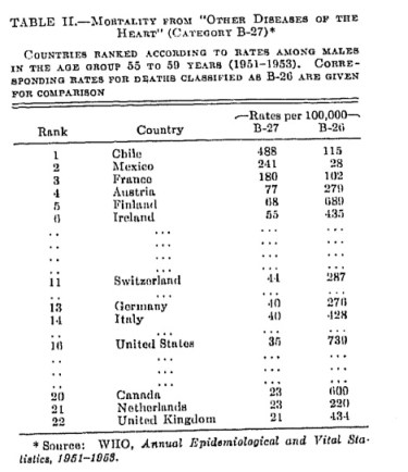 …unless there is a reasonable explanation for the high rates in these countries in this less definitive group of “other diseases of the heart,” it may be safer to operate on the assumption that in these three countries [Chile, Mexico, and France] some deaths from arteriosclerotic and degenerative heart disease are being recorded under the broad group of “other diseases of the heart.”